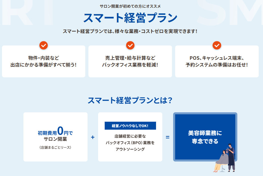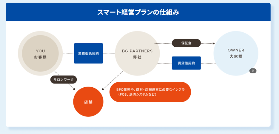 「スマート経営プラン」は、物件・内装・設備などの初期費用を立て替えるとともに、売上管理や給与計算などのバックオフィス業務を包括的に支援するサービスです。毎月定額制で、売上歩合は発生せず、ビューティガレージでの商材仕入れの際にも割引も受けられます。